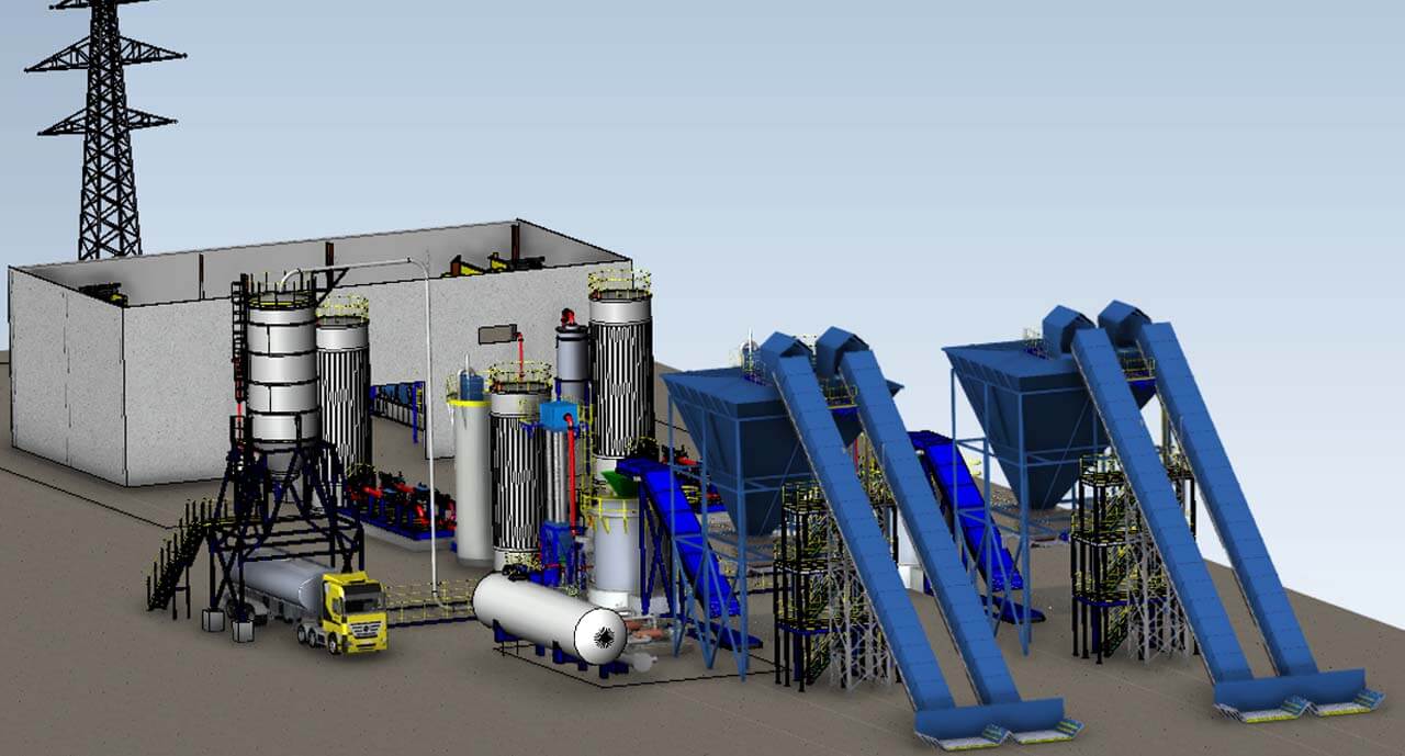 A 5MW biomass processing plant and bio-oil production facility, complemented by a 1MW solar field, harnesses solar energy to offset the power consumption of processing equipment. The system processes bio-crude oil and sells it to refineries. Additionally, biomass waste is converted into syngas fuel to generate electricity, contributing to the grid.